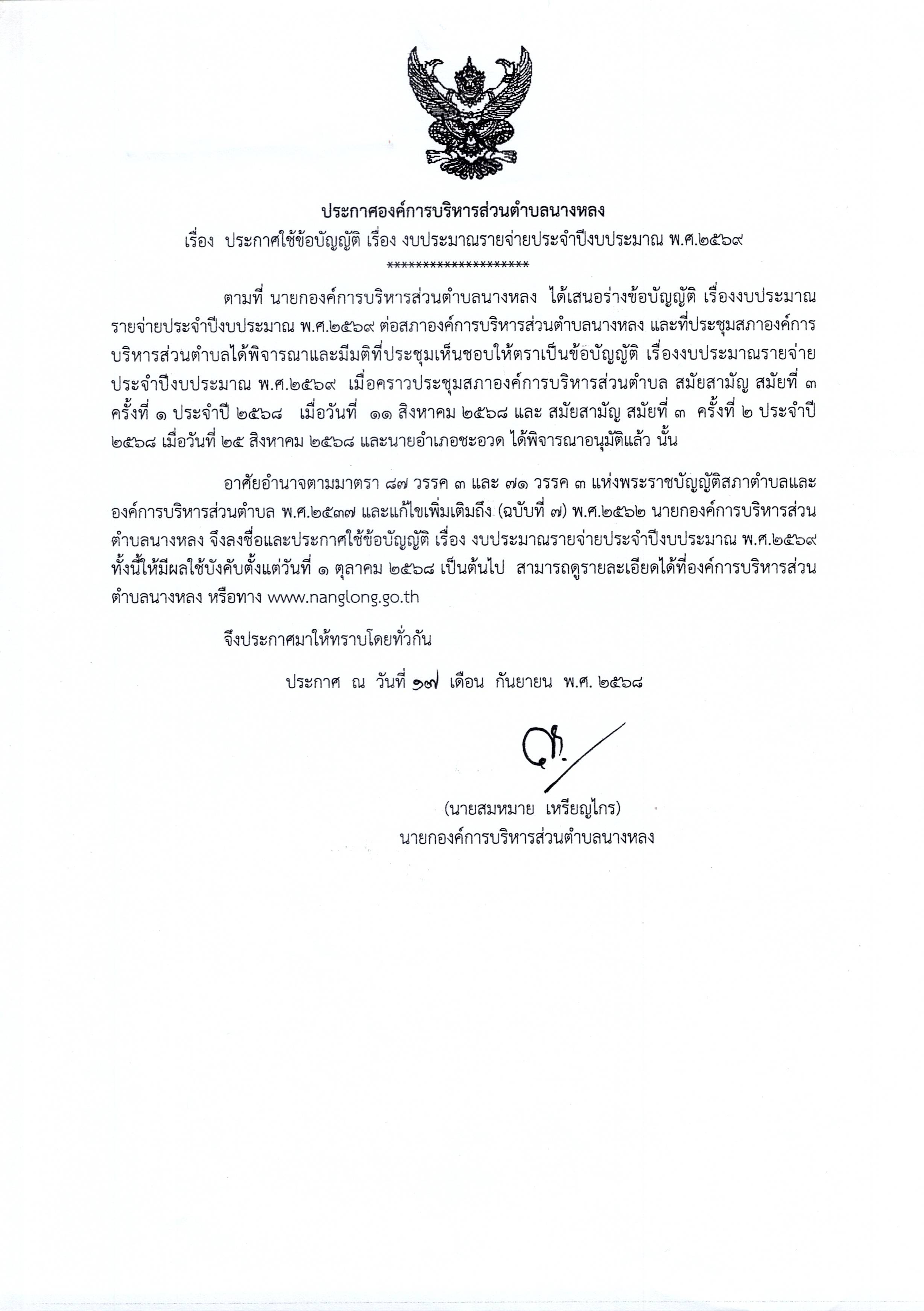 ประกาศใช้ข้อบัญญัติ เรื่อง งบประมาณรายจ่ายประจำปีงบประมาณ2569