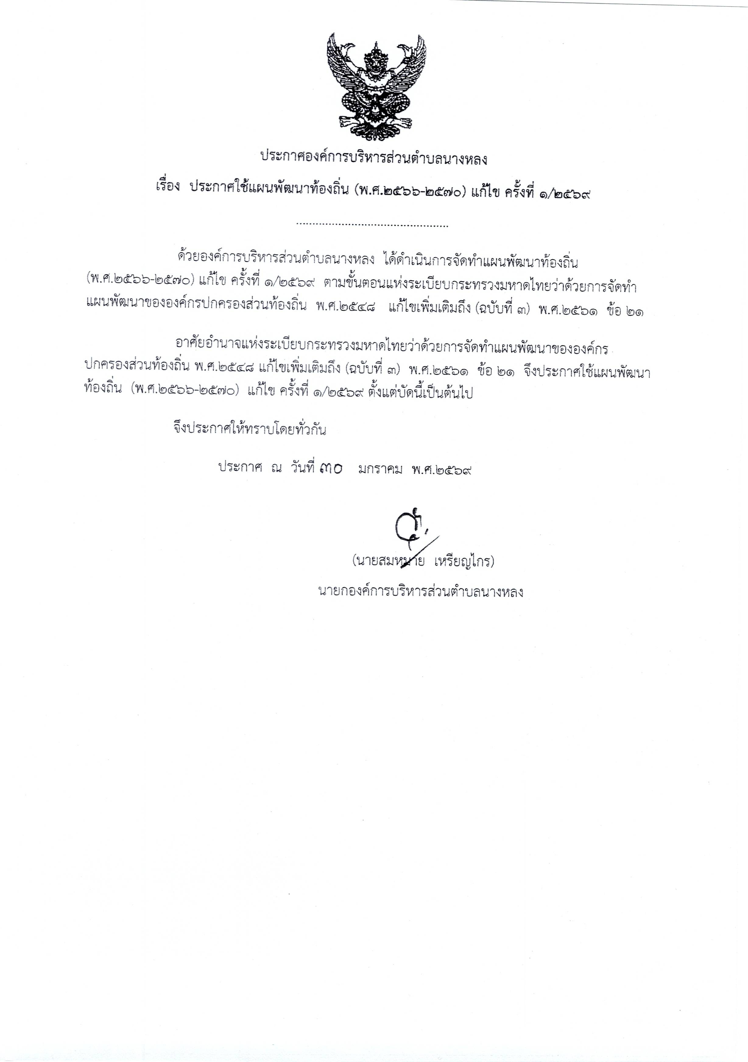 ประกาศใช้แผนพัฒนาท้องถิ่น พ.ศ.2566-2570 แก้ไข ครั้งที่1/2569